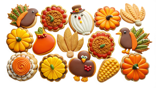 Colorful autumn-themed cookies with festive shapes transparent