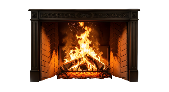 Bronze fireplace crackles with orange flames and flying sparks, creating a cozy indoor scene suitable for seasonal backgrounds, or holiday themes.