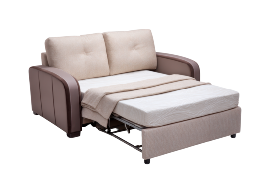 An opened beige sofa bed with two pillows and storage drawers is displayed against a black background.