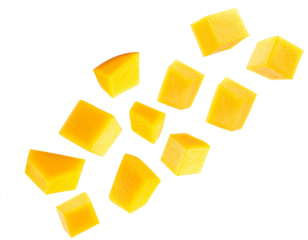 Fresh flying falling yellow mango pieces isolated on transparent background