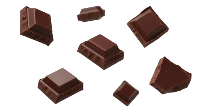 Falling chocolate pieces on a white background, perfect for confectionery, desserts, food product designs, and indulgent advertising campaigns