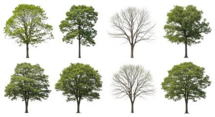 Collection of eight diverse deciduous trees some with full foliage and others as bare winter silhouettes isolated on transparent background