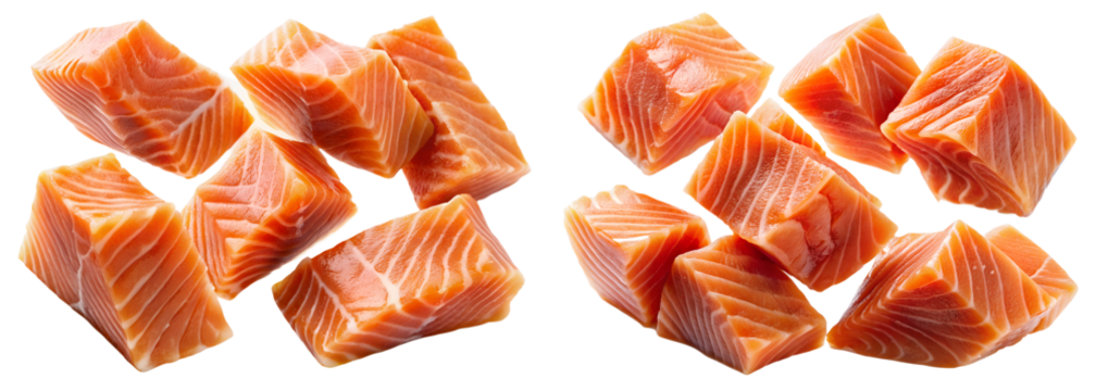 Falling Raw Salmon slices highly detailed isolated on transparent background PNG file, clipping path, cubes of red fish, for sushi or salad, macro