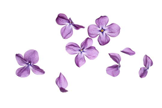 Petals of Purple Flower (Lilac) flying or falling in the air, spring meadow flora isolated on background.