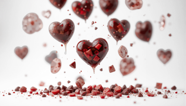 Vibrant glossy red hearts cascade downwards, symbolizing love, passion, and romance for romantic celebrations and events.