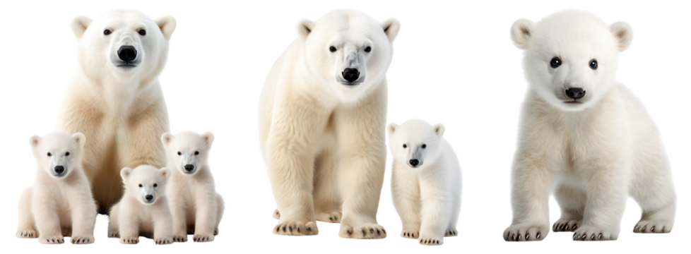 Polar bear family set. Mother bear with children bears. Little polar bear baby. Isolated on a transparent background.