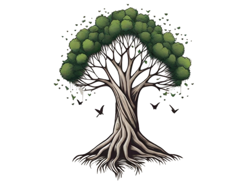 Family planting a tree adorned with hearts and gifts, symbolizing love, generosity, and togetherness, isolated on transparent background