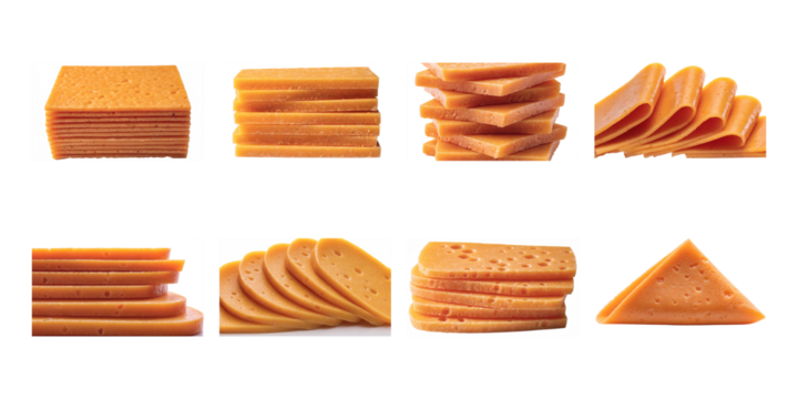 Collection of various orange cheddar or processed cheese slices stacked and fanned out illustrations on transparent background