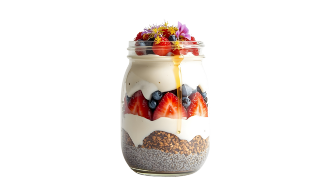 Healthy breakfast granola meal with fruits, fancy yoghurt with chia pudding, and honey front view, png, isolated on transparent background, perfect for food marketing and advertising