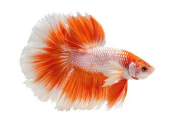 Orange and white betta fish isolated on transparent background. Ornamental siamese fighting fish with flowing fins brightly colored isolated on white background.