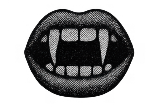 Vampire fangs revealing mouth in a black and white halftone style, gothic halloween monster lips, transparent background