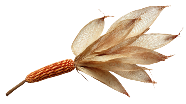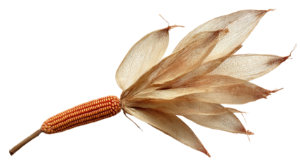 Decorative composition of corn cob with husk fanned out isolated on a Transparent background, PNG file.