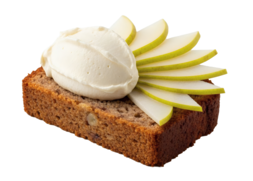 Delicious slice of quick bread with creamy topping and fanned fresh pear slices