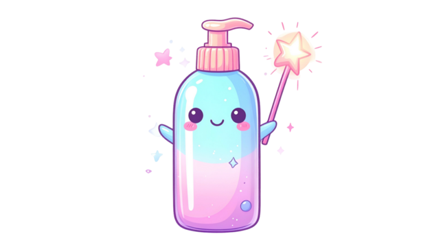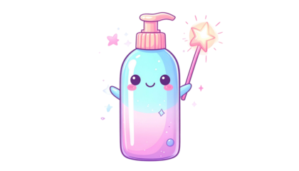 A cartoon liquid dispenser character with a star wand, colorful, cute, and happy