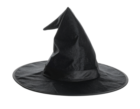 Black witch hat with pointed shape and buckle, representing magic, fantasy, and halloween season theme