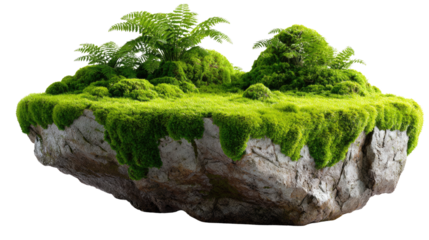 Floating Island Oasis: Lush green moss, vibrant ferns and a rocky terrain create a serene, floating island ecosystem, perfect for fantasy or nature-themed designs.