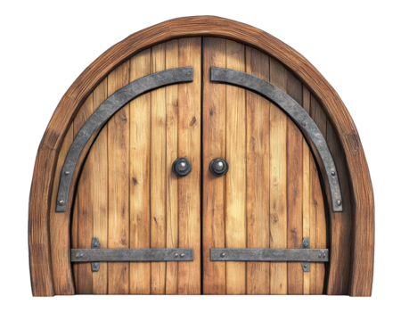 wooden arched door with metal accents, featuring rustic design and sturdy construction, perfect for underground entrance or fantasy setting