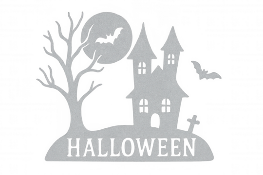 Silver glitter effect halloween text with haunted house, bats, dead tree, and full moon on transparent background