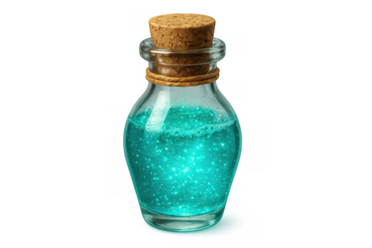 Turquoise luminescent magical potion glowing within corked glass bottle, sparkling against transparent backdrop