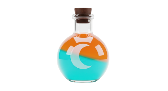 Isolated glass bottle of blue and orange potion with cork lid and a crescent moon pattern