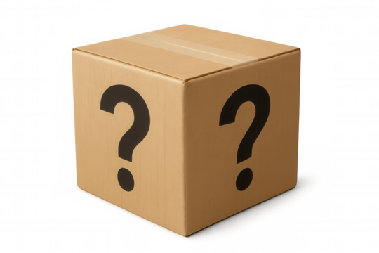 Cardboard box featuring large question marks on sides, symbolizing mystery and uncertainty against transparent background
