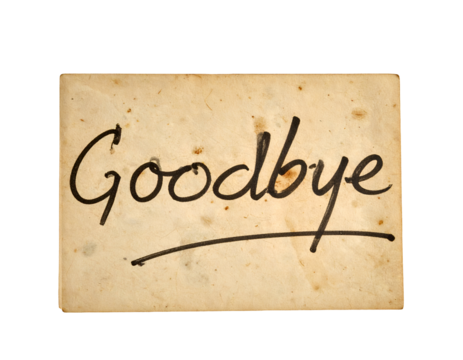 Goodbye handwritten text on vintage paper card with aged grunge texture farewell message close up on isolated background