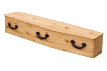 Wooden coffin with handles, signifying death, burial, and mourning. Funeral casket for interment