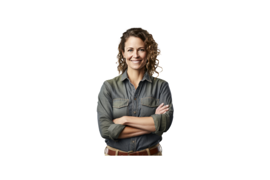 Smiling female farmer in denim overalls and plaid shirt Isolated on white background