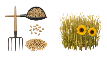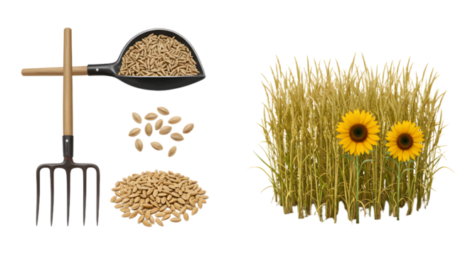 FARMING - Sunflower and wheat grains with garden fork and scoop on white background, agricultural harvest concept, ideal for farming or gardening projects