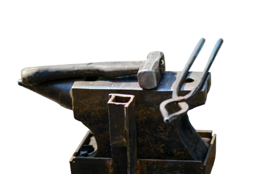Hammer and tools for forging metal by a blacksmith, isolated on white background. Blacksmithing in retro style outdoors