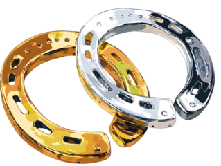 Golden and silver horseshoes overlapping against a dark stark background