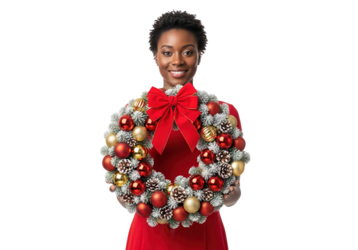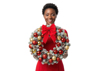 Smiling Woman Holding Christmas Wreath Isolated on White