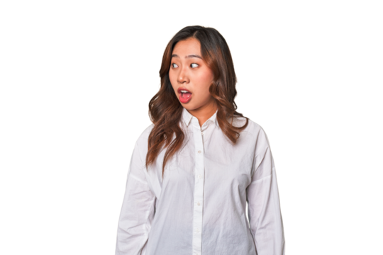 Happy, cosmetics and asian woman with comic eyes for fashion in png or transparent and isolated background. Girl, smile and gen z with stickers or makeup with style and beauty face with happiness.