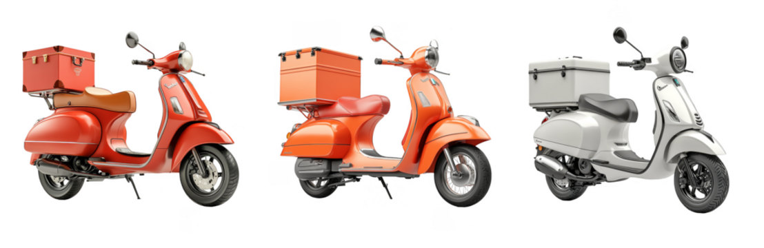 Delivery scooters with cargo boxes transportation and logistics service transparent background