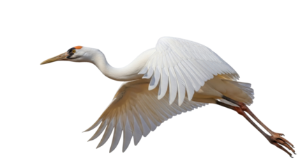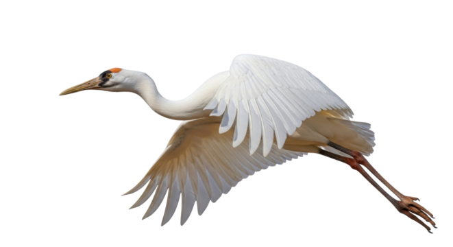 A majestic whooping crane in graceful flight, soaring through the air with powerful wings, against a bright, clean background.