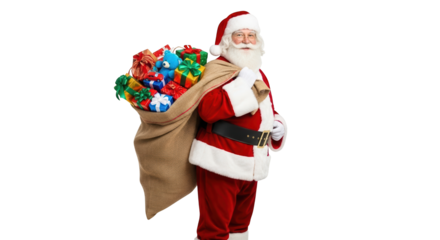 Vintage santa claus carrying a sack of gifts, traditional red suit, long beard, classic christmas figure illustration, transparent background