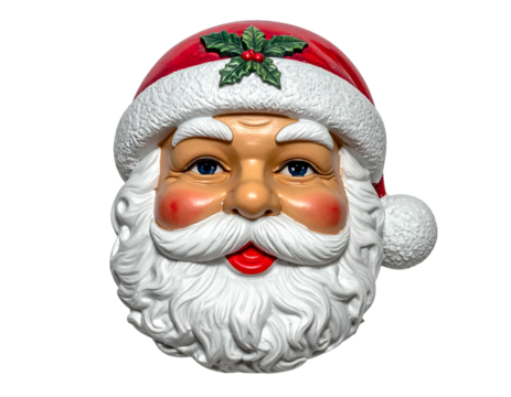 Close-up of a vintage, jolly Santa Claus mask with red hat