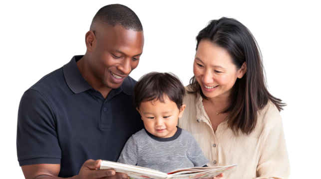 A joyful African American father and Asian mother share a storybook moment with their young son, filled with smiles.