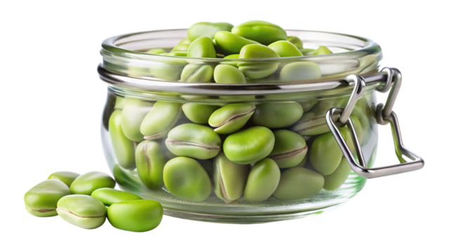 A clear glass jar filled with fresh green fava beans and some scattered on the side isolated on transparent background