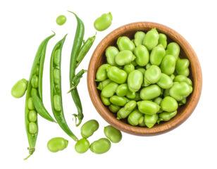 A rustic wooden bowl filled with fresh green fava beans and a few scattered beans isolated on transparent background