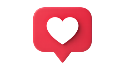 A vibrant 3d rendered social media 'like' icon in a speech bubble with a black heart isolated on transparent background
