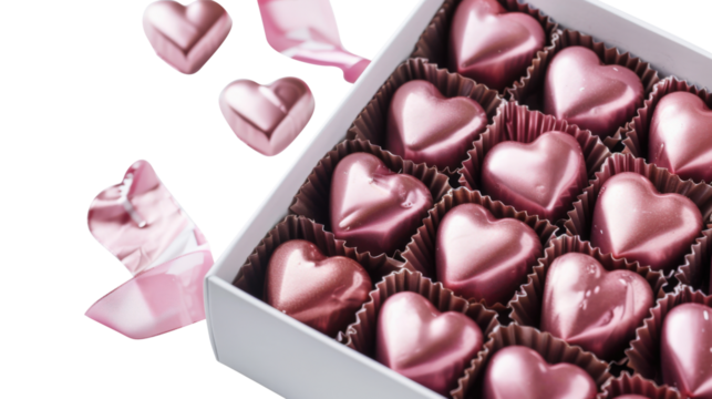 Heart Shaped Chocolates in Pink Gift Box Isolated on White Background