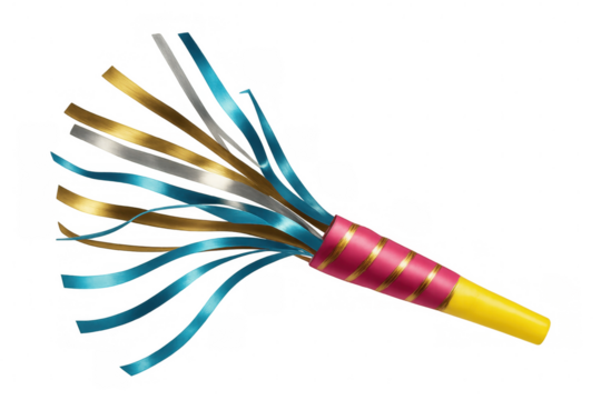 Colorful party horn blower exploding with metallic ribbons, isolated on transparent background, perfect for festive celebrations
