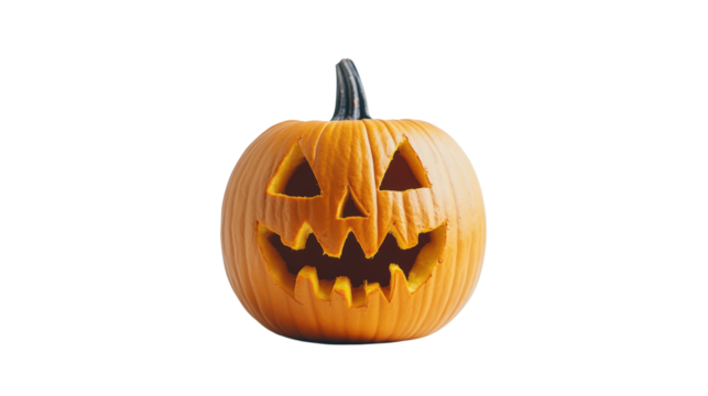 A smiling jackolantern with a carved face, isolated on a transparent background