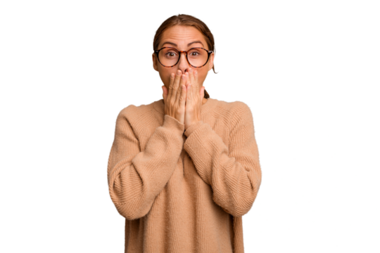 Young caucasian woman cutout isolated shocked, covering mouth with hands, anxious to discover something new.
