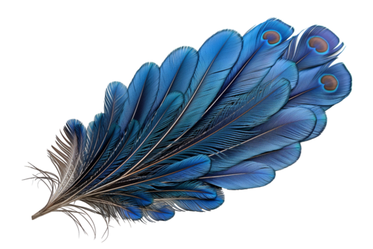 A delicate peacock feather showcasing vibrant hues against a clean, white backdrop, capturing nature's intricate beauty and design in fine detail isolated on transparent background