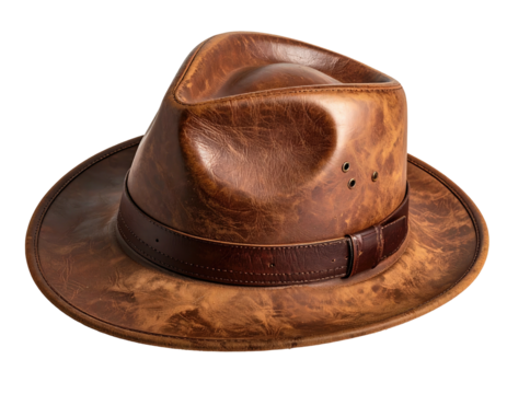 Stylish floating brown fedora hat with blue gray ribbon on transparent background