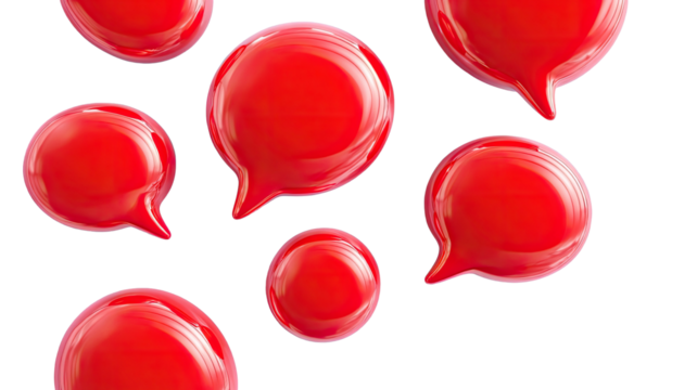 Glossy red speech bubbles floating on a black backdrop, various sizes, 3D render
