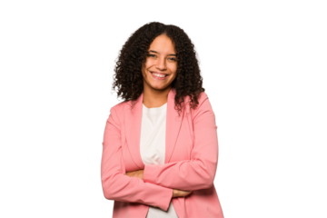 Young african american curly woman isolated who feels confident, crossing arms with determination.