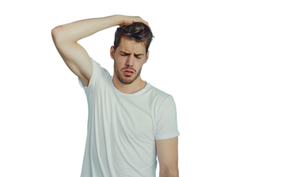 Young woman holding head feeling frustrated in transparent background